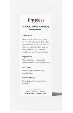 Healthy skin is hydrated skin and nothing does that better than Timeless Skin Care Hyaluronic Acid Pure. This superpower ingredient in its purest form is key in attracting and retaining optimal moisture levels in the skin. A must have for all skin types, it smooths, plumps and helps your makeup stay true throughout the day. Use HA both morning and evening for more radiant, glowing skin.